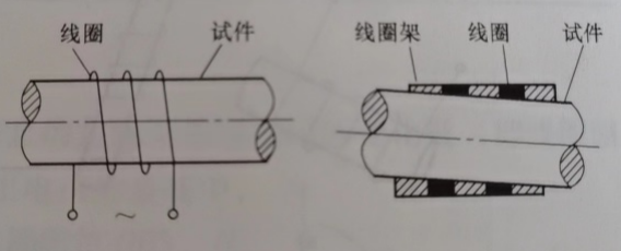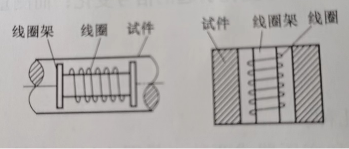 (二) 無損檢測中渦流傳感器的另外一種分類,是一傳感器線圈和被檢測試樣工件的相對位置來分類,即a)傳感器線圈將被檢測試樣工件包圍起來,市場上稱之為外穿過式探頭,如下圖:
