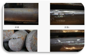 該類問題的特征:沿軋制方向與鋼材表面有一定傾斜角、近似裂紋的缺陷稱折疊,一般呈直線狀,也有鋸齒狀,出現(xiàn)在鋼材的局部或全長,深淺不一,內(nèi)有氧化鐵皮,有時(shí)也呈舌狀,有規(guī)律連續(xù)分布在鋼材表面上。 鋼材表面局部重疊,有明顯的折疊紋。